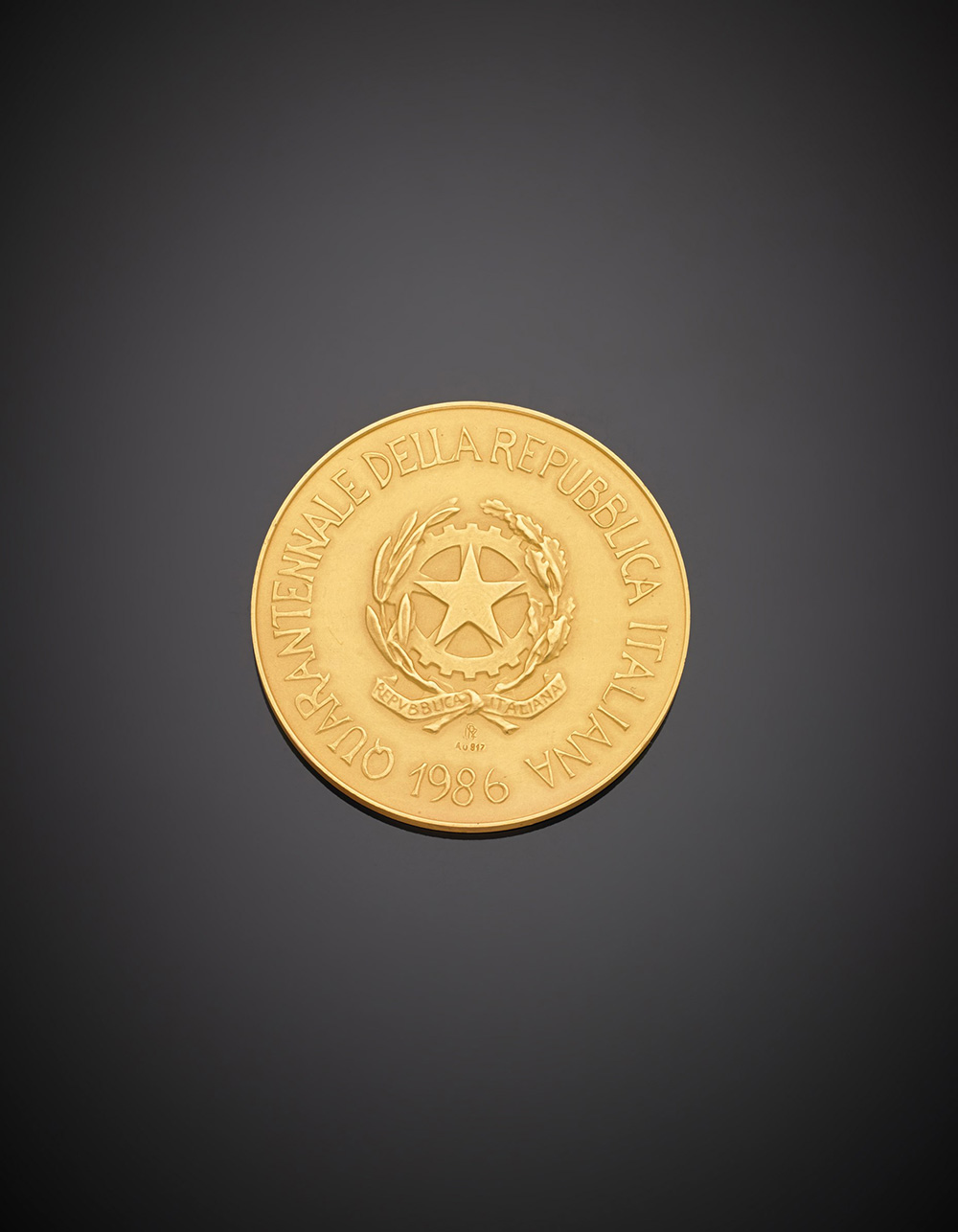 Medaglia commemorativa in oro giallo 917/1000 del quarantennale della Repubblica italiana del 1946, Premio Esportazione, g. 44,30. In scatola originale Yellow 22K gold commemorative medal, fortieth anniversary Italian Republic, Export prize, g.44,30. In original case