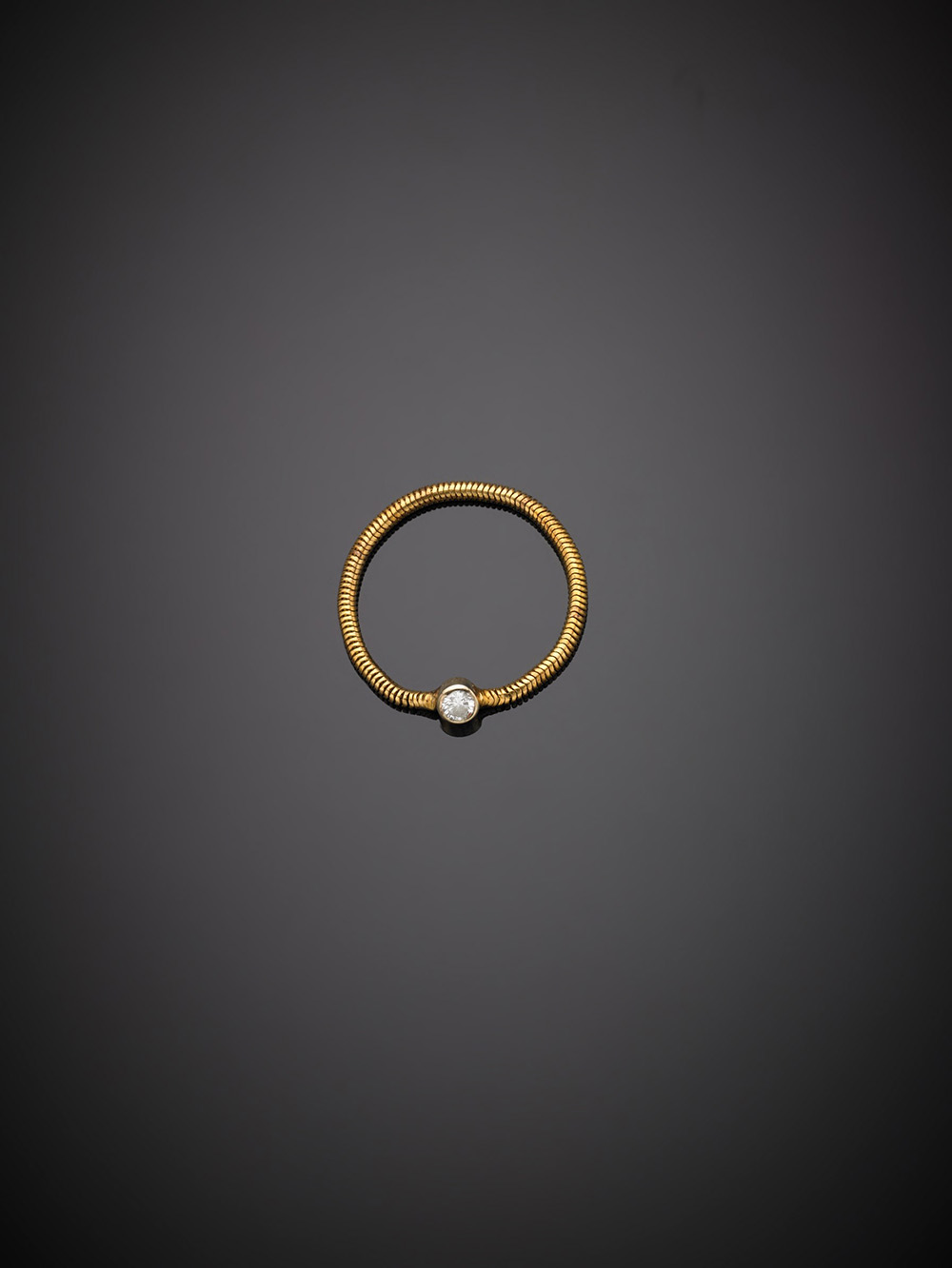 Anello a maglia tubogas in oro giallo e diamante montato su castone in oro bianco, g. 1,50, misura 17/57 Bi-coloured gold and diamond tubo-gaz ring, g. 1,50, size 17/57