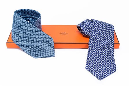 HERMES Lotto di due cravatte in seta nei toni del blu, con una scatola HERMES Lot comprising two silk ties, one box