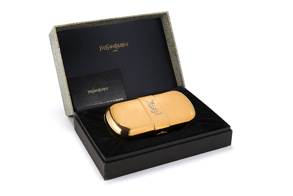 YSL Paris Clutch in metallo placcata oro con grande logo sul fronte e piccola pasta vitrea cabochon sulla chiusura, scatola originale e garanzia (cm 16.50) YSL Paris Gold plated clutch centered by large logo, original box and guarantee (cm 16.50)
