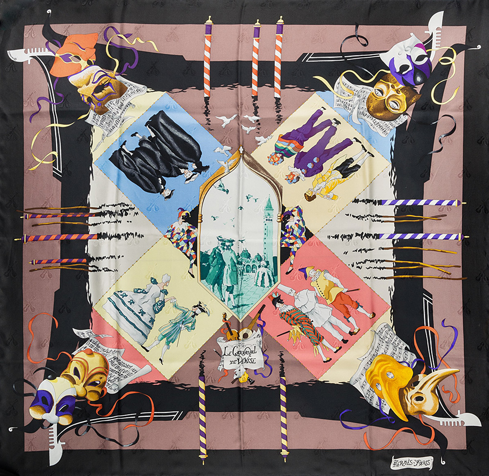 HERMES Le Carnaval de Venise, Hubert de Watrigant 1993. Foulard in seta,...