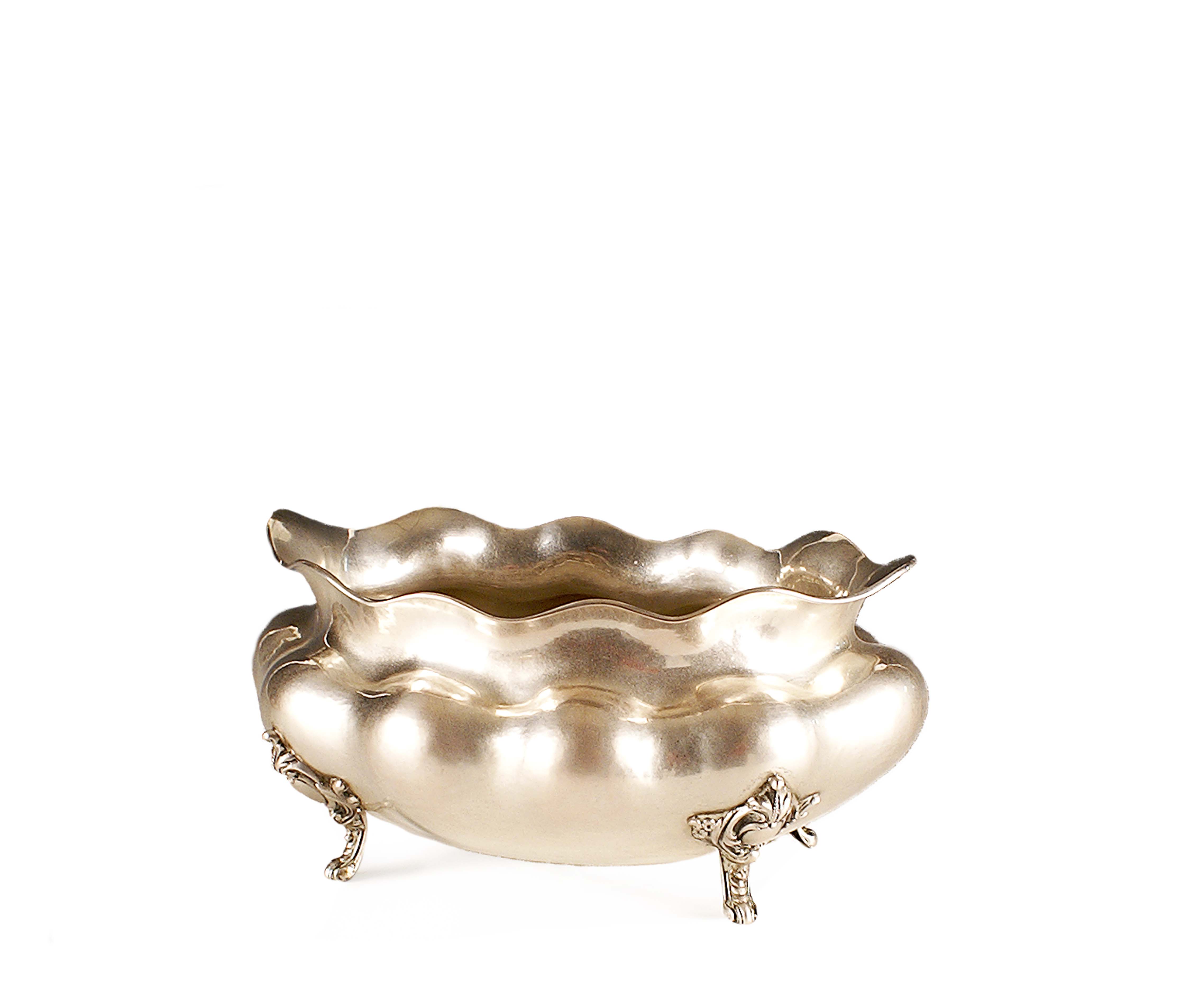 Centrotavola in argento poggiante su quattro piedini a voluta, gr. 920, cm. 14,5x31x23.