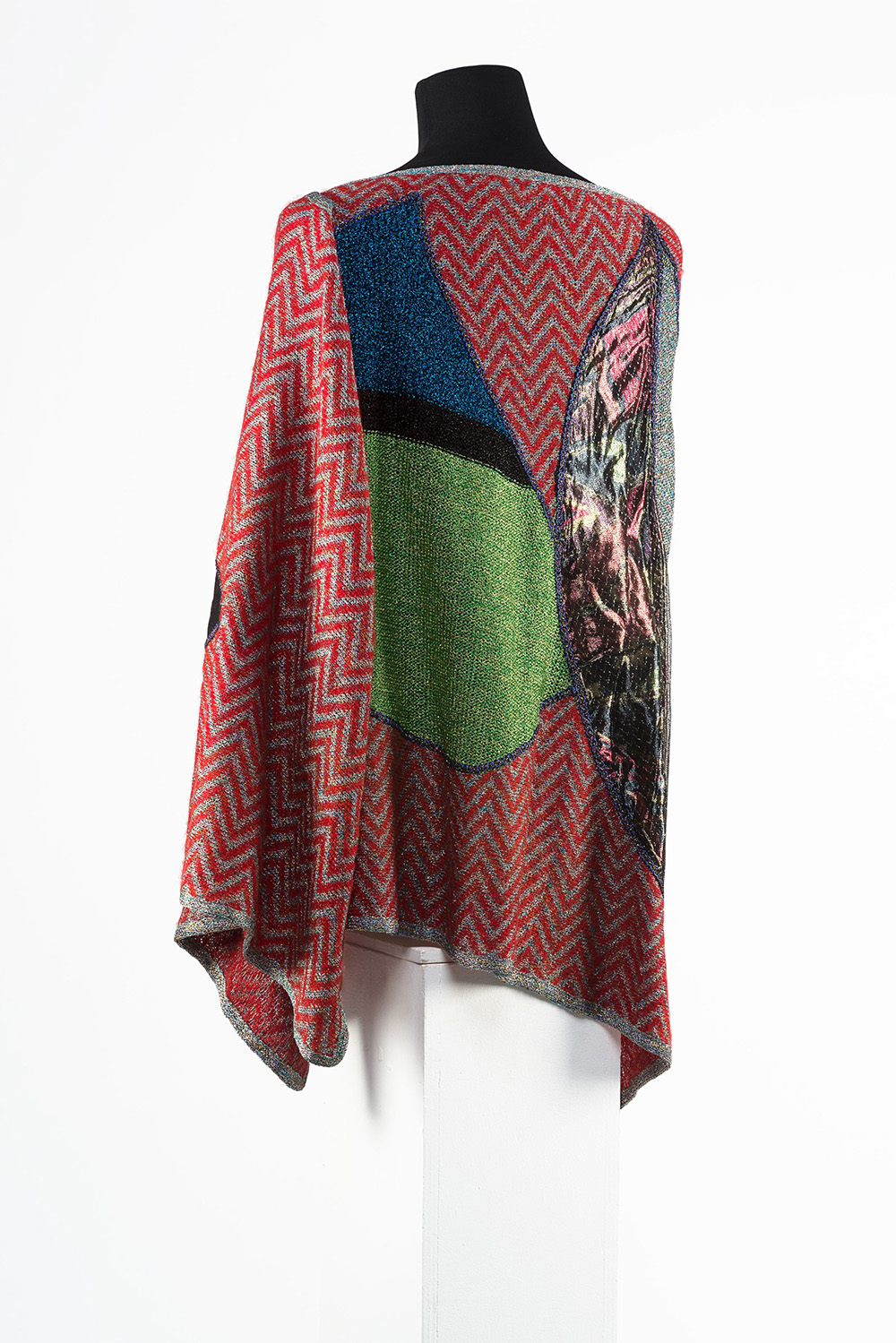 BORBONESE Grande stola di maglia in filo di lurex rosso, argento e multicolore fondo geometrico con disegno di grandi vele spiegate BORBONESE One of a kind multicolour knit lurex shawl