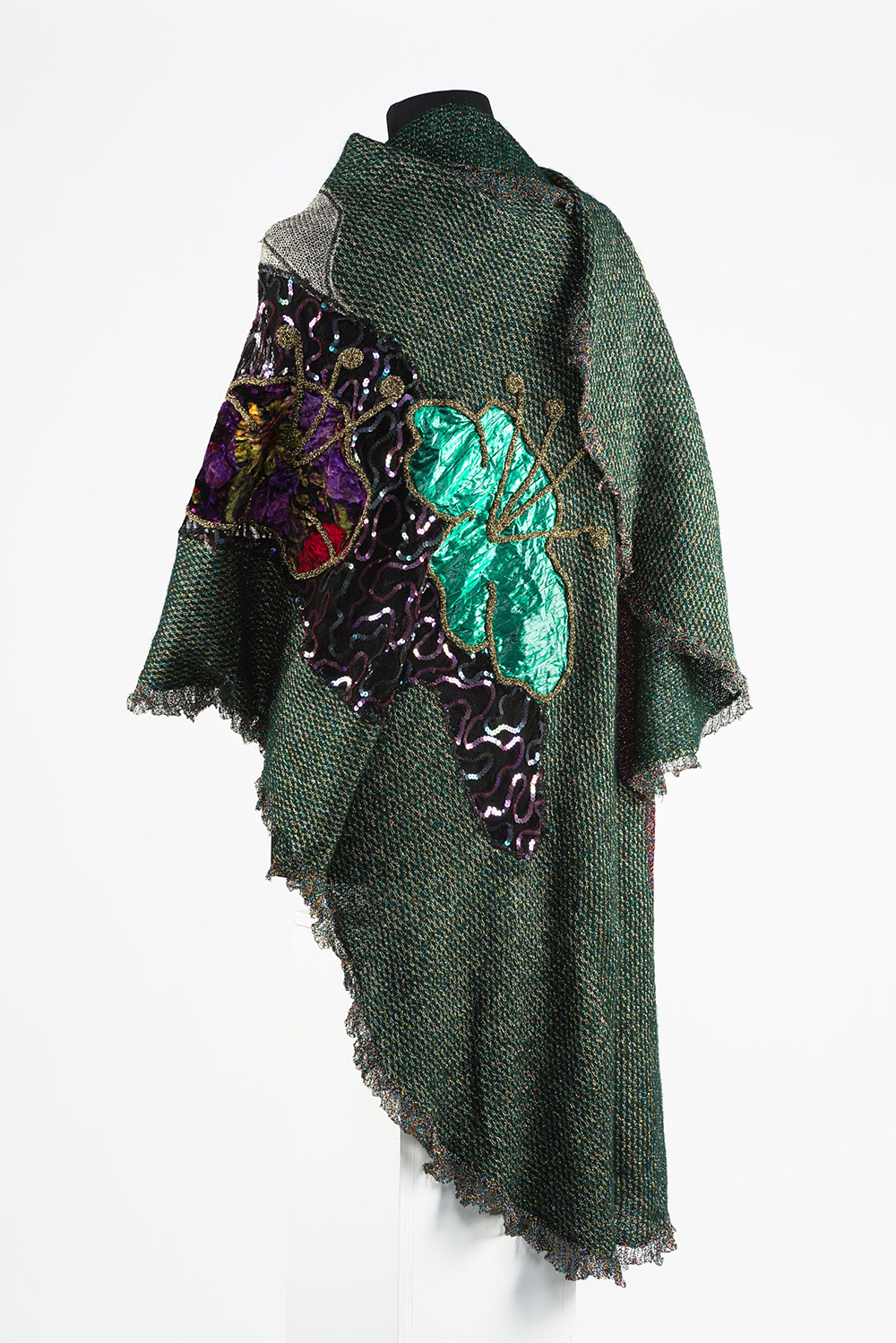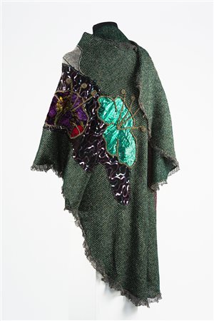 BORBONESE Grande stola di maglia in filo di lurex verde bottiglia, argento e multicolore, con inserti in pizzo, velluto, seta e pailletes a formare un disegno floreale BORBONESE One of a kind lurex knit shawl