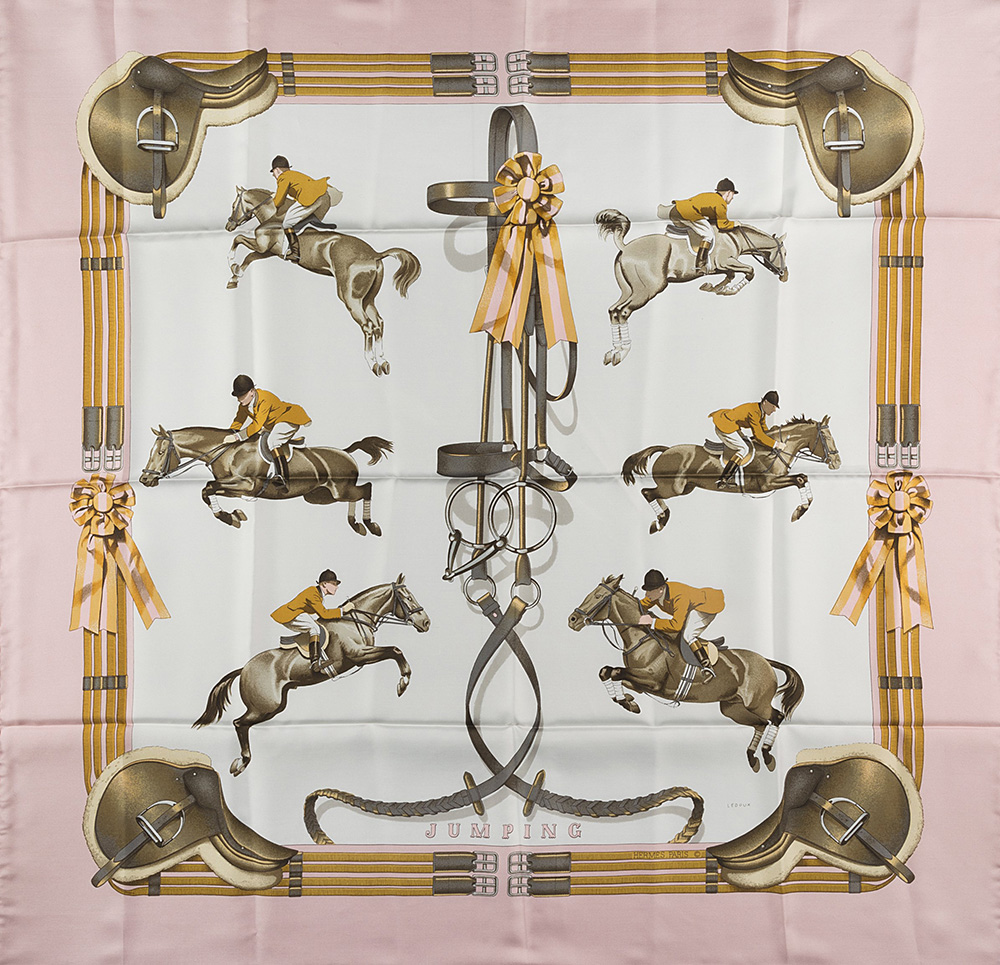 HERMES Jumping, Philippe Ledoux 1971. Foulard in seta, bordo rosa pallido...