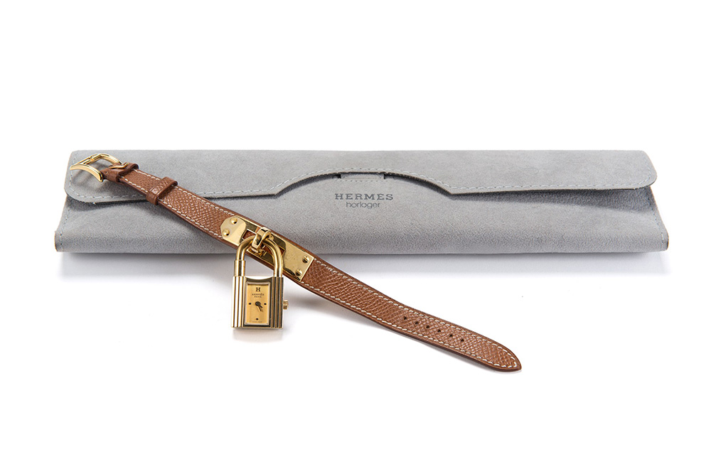 HERMES - PARIS Bracciale orologio in pelle color miele con lucchetto a orologio in metallo color oro, astuccio originale HERMES - PARIS Lock-watch leather bracelet with original case