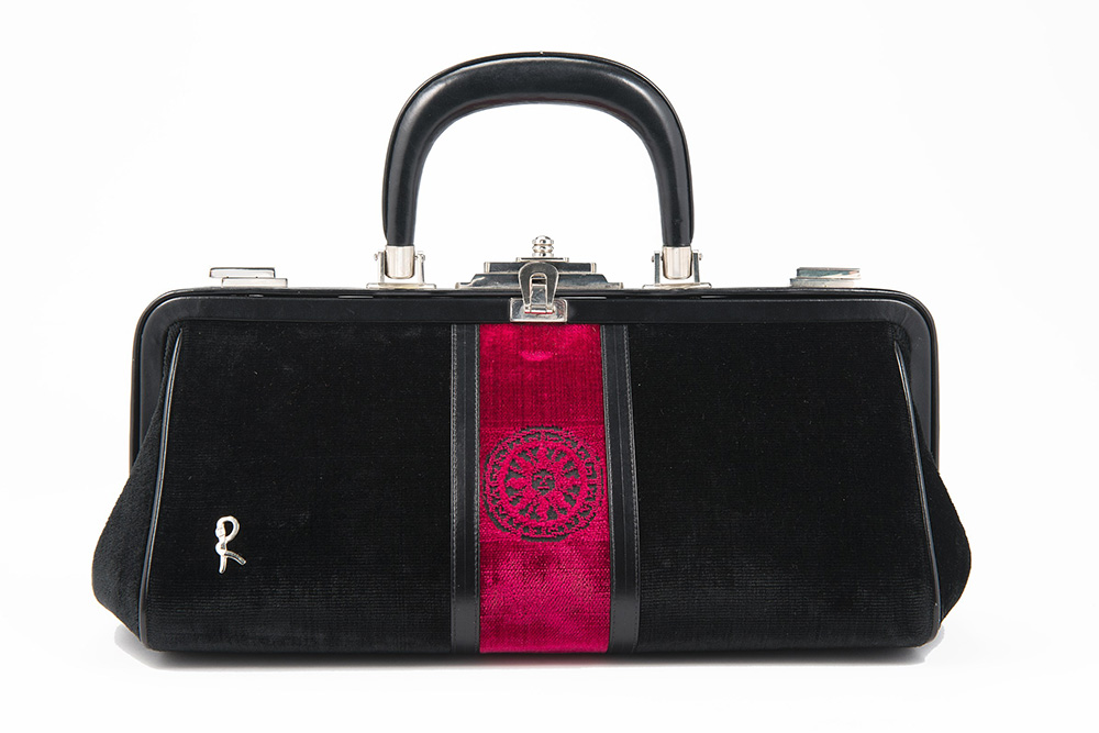 ROBERTA DI CAMERINO Borsa Bagonghi, in pelle nera, banda in velluto rosso e...