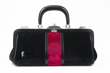 ROBERTA DI CAMERINO Borsa Bagonghi, in pelle nera, banda in velluto rosso e rifiniture color argento, ( cm 39) (lievi difetti) ROBERTA DI CAMERINO "Bagonghi" bag in black leather with central red velvet band (cm 39) (minor defects)