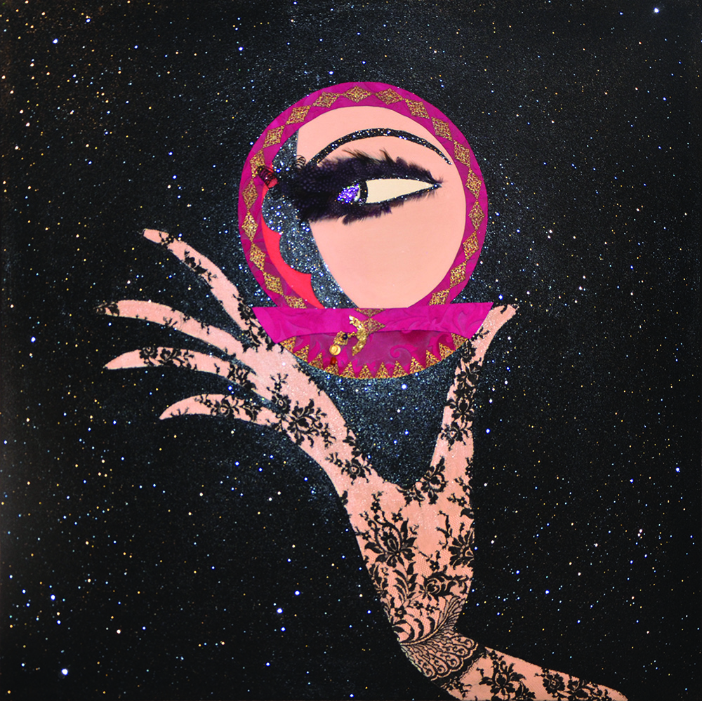 ROBERTO GUARINIELLO Ertè, 2015 acrilico, glitter, camoscio, piume, pizzo cm 100 x 100 Autentica su foto