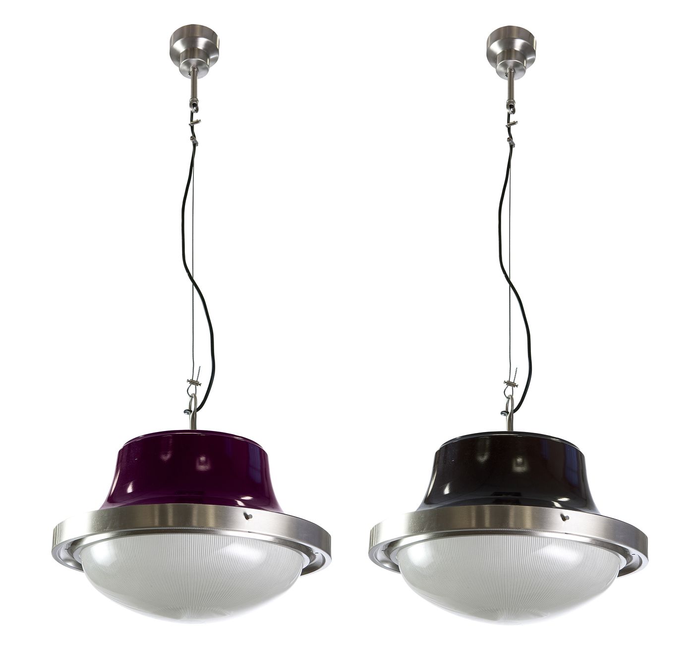 MAZZA SERGIO – Tau, Due lampade a sospensione. Ottone nichelato opaco e alluminio laccato. Coppa diffusore in cristallo pressato. (una con riflettore nero, una con riflettore testa di moro) Prod. Artemide 1965 circa, Diam. cm 40. Bibl.: Fotocopia catalogo Artemide 1970 disponibile