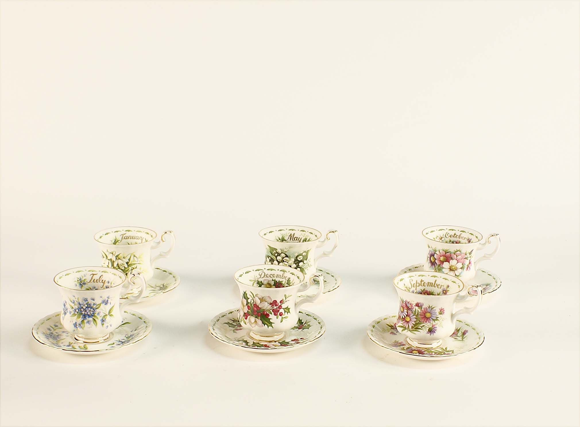 Servizio da caffè in porcellana Royal Albert, dipinto in policromia a motivo floreale a raffigurare i mesi dell'anno composto da dodici tazze con relativi piattini.