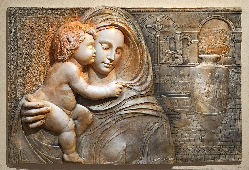 ELVIO MARCHIONNI Maternità tecnica bassorilievo dipinto cm 75 x 50 esemplare 4/9 firma in basso al centro autentica timbro cn firma sul retro