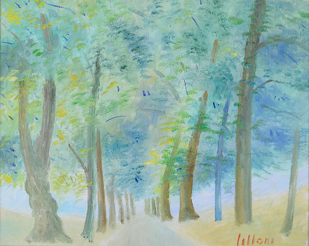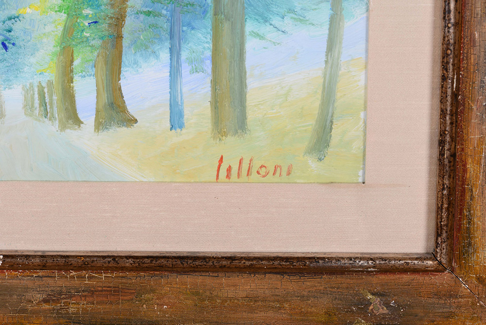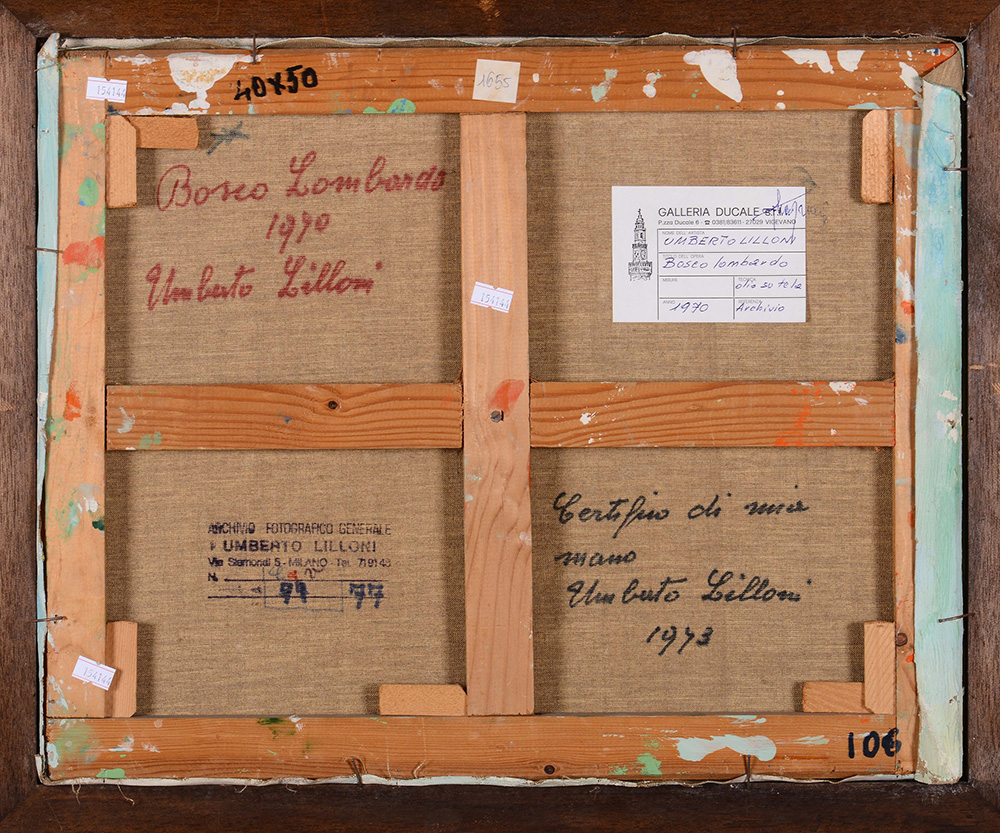 Umberto Lilloni (1898-1980), Bosco lombardo, 1970 olio su tela, cm 40x50 firmato in basso a destra Al retro data, titolo e autentica dell’artista Etichetta al retro della Galleria Ducale, Vigevano Timbro al retro dell’Archivio fotografico generale di Umberto Lilloni