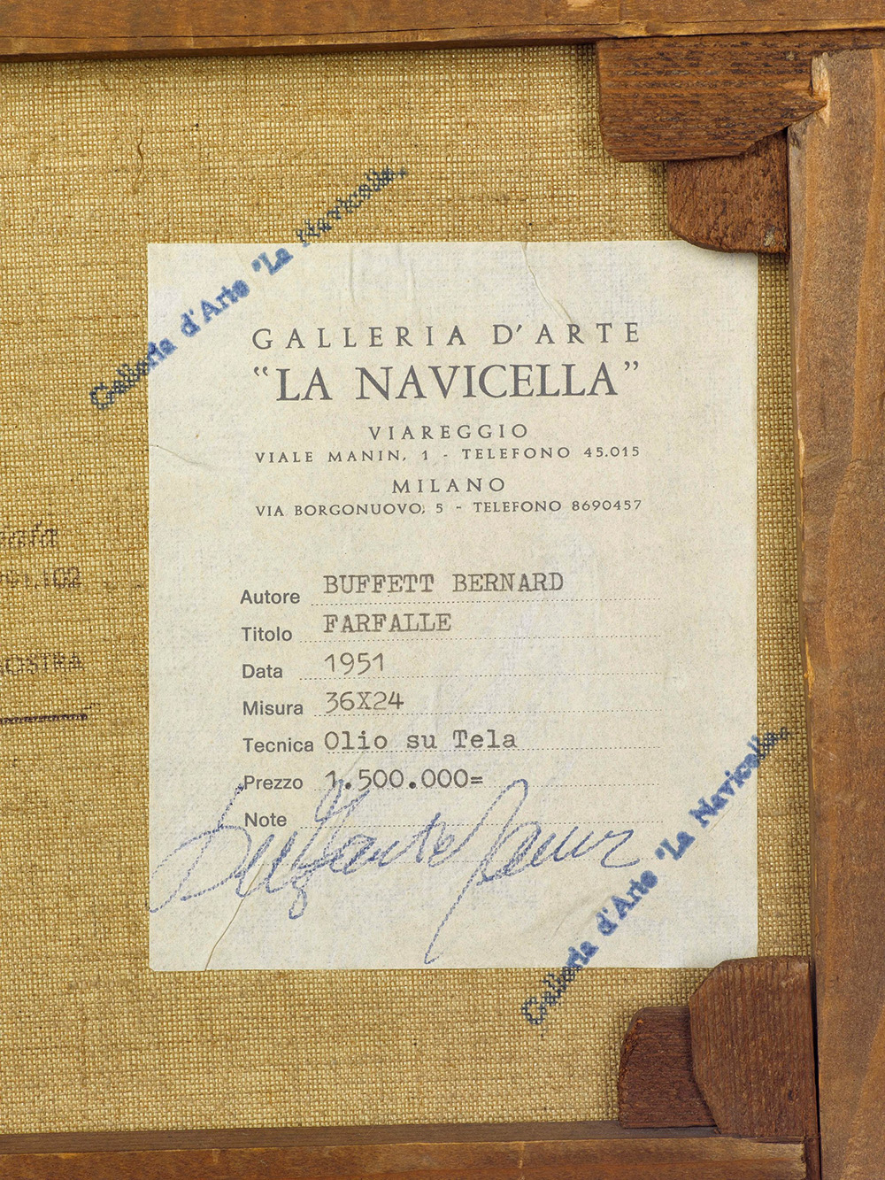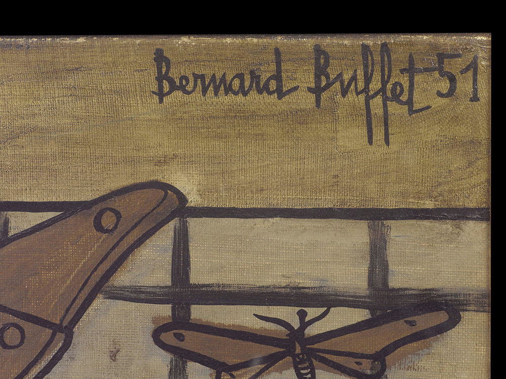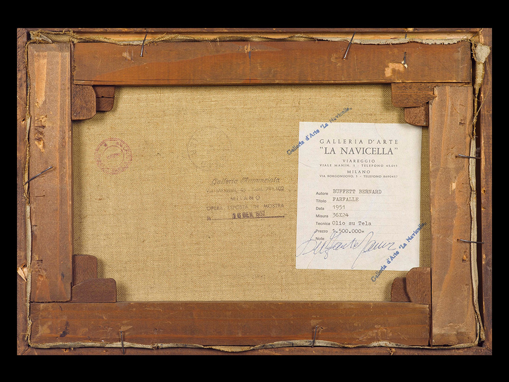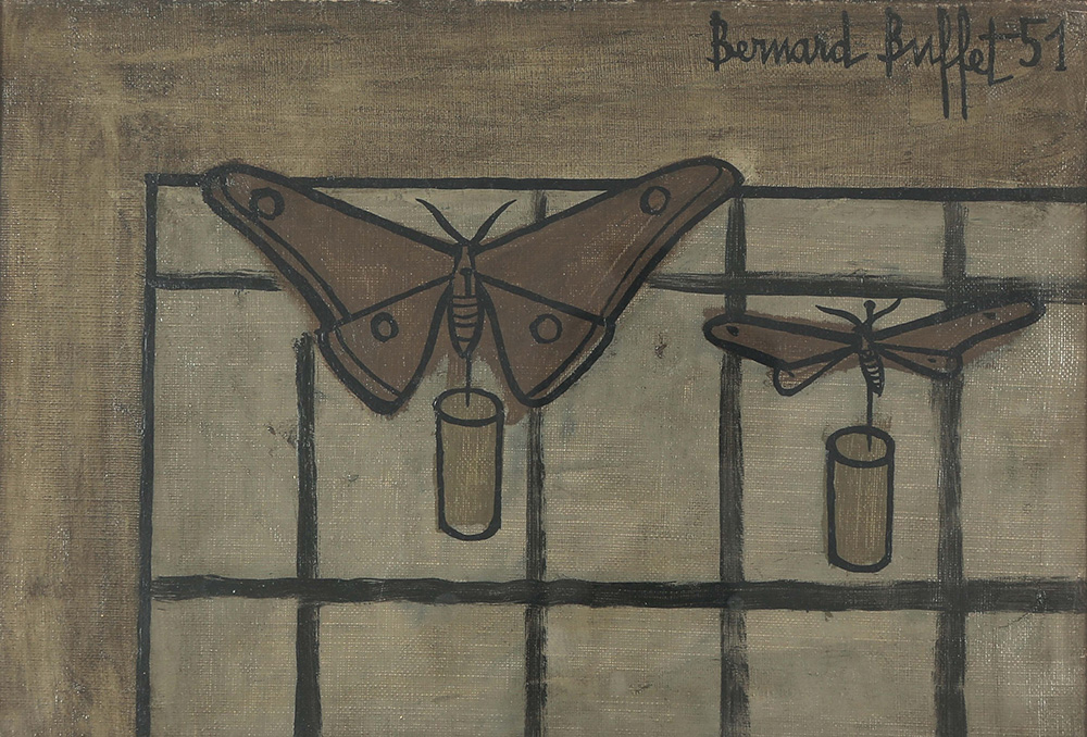 Bernard Buffet (1928-1999), Farfalle, 1951 olio su tela, cm 24x35 firmato e datato in alto a destra L’autenticità dell’opera è stata confermata verbalmente dall’Archivio Bernard Buffet a cura della Galleria Maurice Garnier Etichetta al retro della Galleria La Navicella, Milano Timbro al retro della Galleria Annunciata, Milano, Esposizioni: Galleria Annunciata Milano, Mostra personale, 1957