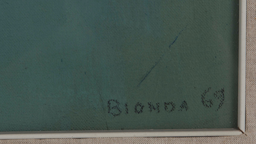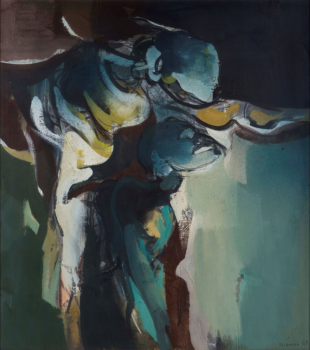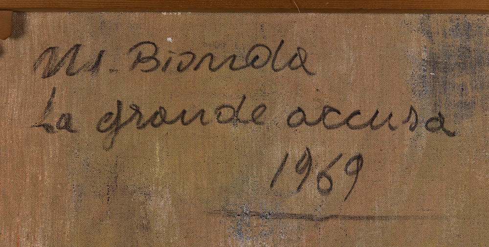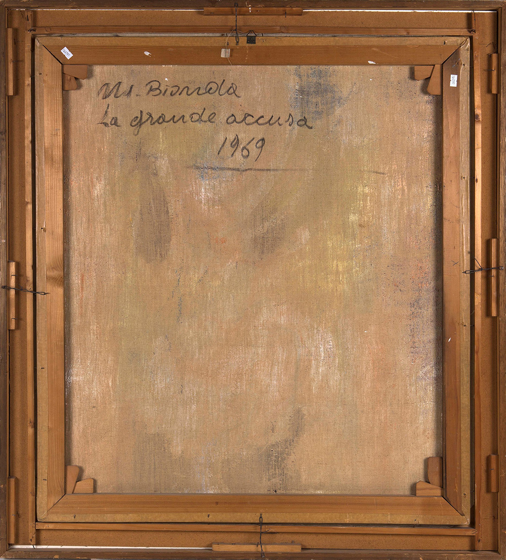 Mario Bionda (1913-1985), La grande accusa, 1969 olio su tela, cm 90x80 firmato e datato in basso a destra firmato, datato e intitolato al retro