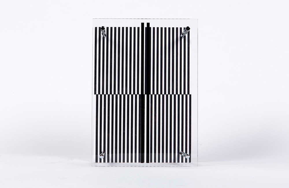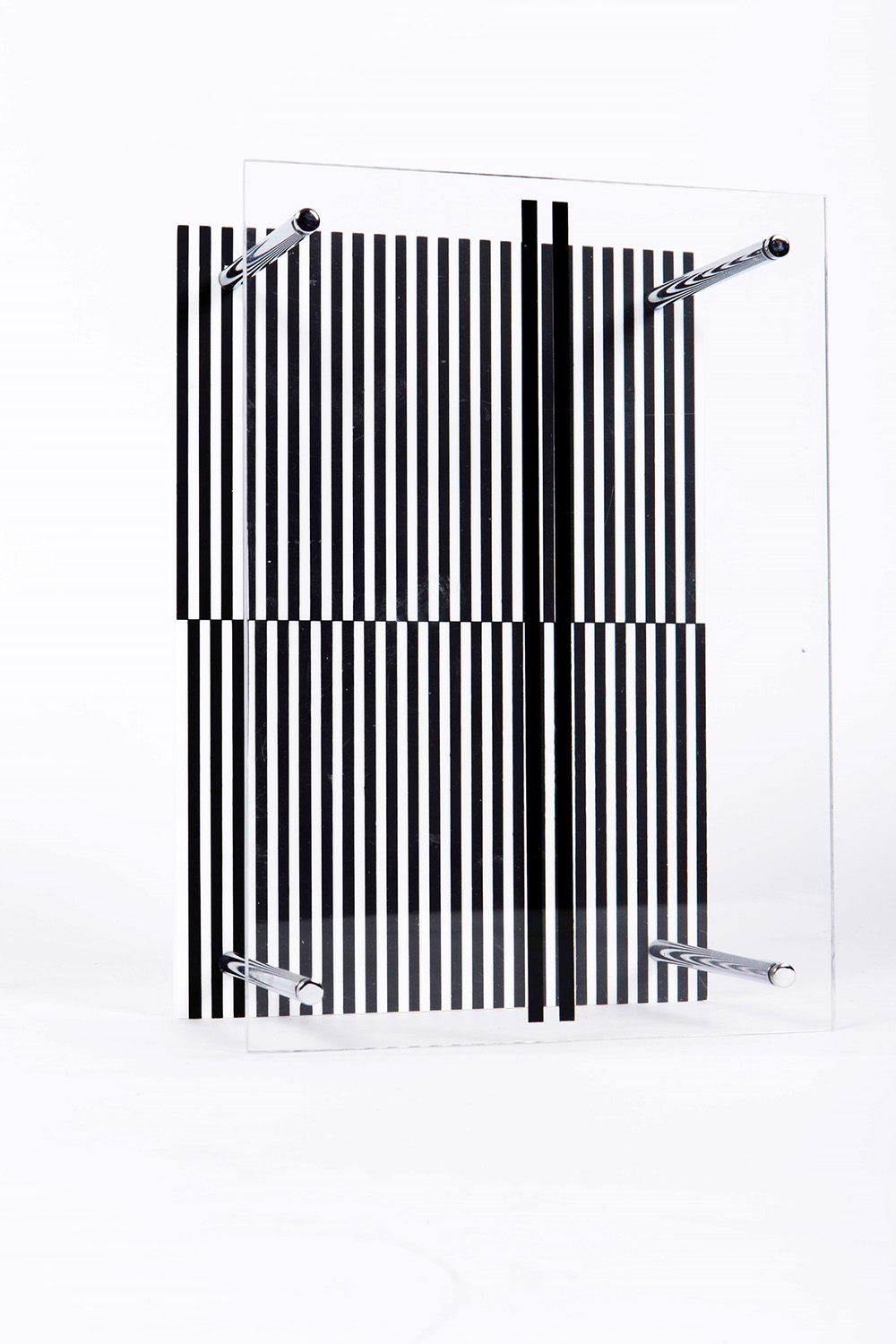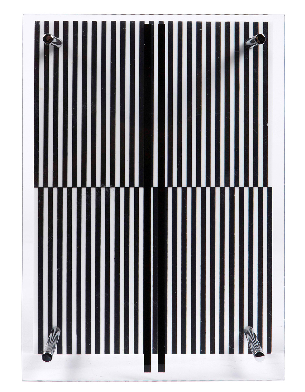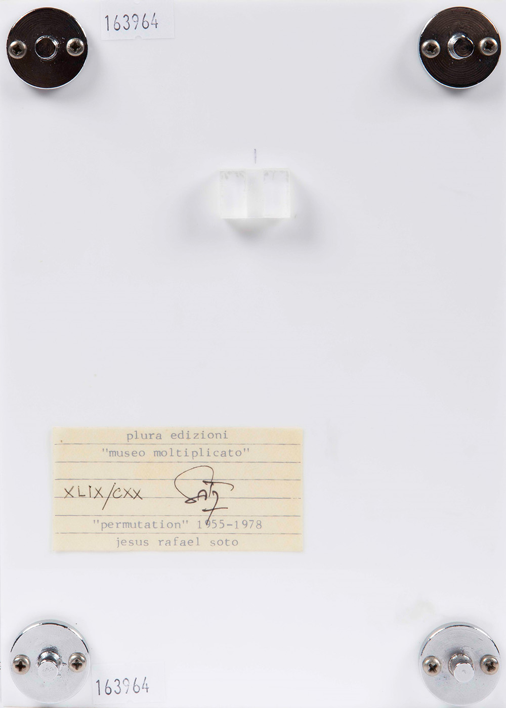 Jesus Raphael Soto (1923-2005), Permutation, 1955/78 multiplo in plexiglass serigrafato e ottone cromato, cm 15x21x10 tiratura 120 esemplari numerati e firmati a mano dall’autore su etichetta con numeri arabi e CXX con numeri romani es. XLIX/CXX Plura Edizioni, Milano