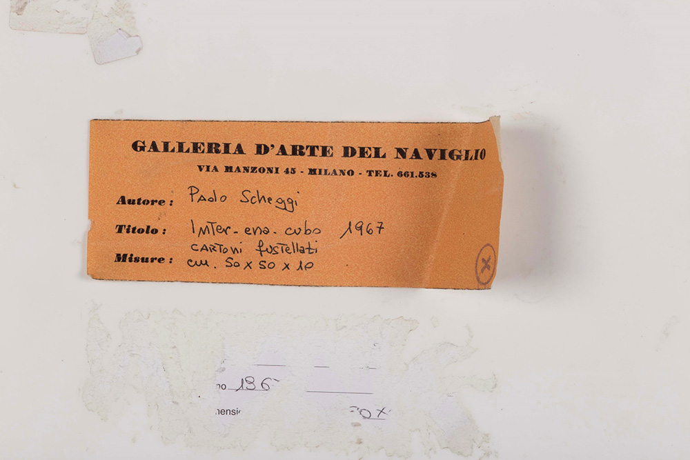 Paolo Scheggi (1940-1971), Inter-Ena-Cubo, 1967 struttura modulare in plexiglass e carta serigrafata, cm 52x52x10 Etichetta al retro Galleria d'arte del Naviglio, Milano Autentica su fotografia a cura di Franca Scheggi in data 22 settembre 2004 con il n. APSM052/0024 Opera registrata presso l'Archivio Scheggi con il n. PS0468, Bibliografia: The Humanistic Measurement of Space, Catalogo della mostra, a cura di F. Pola e Paolo Scheggi, Skira, Milano, 2014, pg. 144, 184 Paolo Scheggi. Catalogue raisonné, Skira, L. Massimo Barbero, Milano, 2016, p. 289, n. 67 I 3