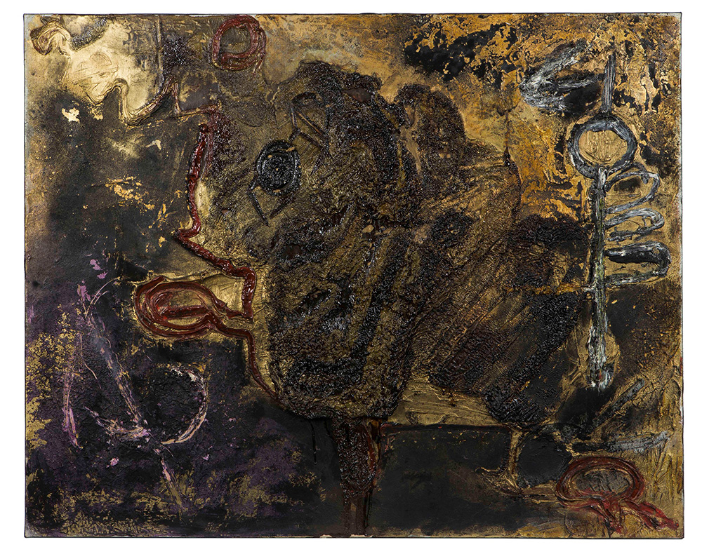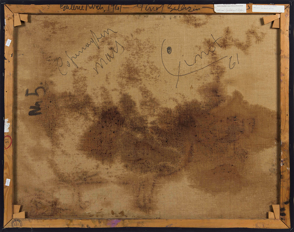 Pinot Gallizio (1902-1964), Dans le creuset de l’or, 1961 tecnica mista su tela (olio, pigmenti metallici), cm 73x92 firmato e datato al retro, Provenienza: Copenhagen, Galerie Birch Copenhagen, asta Kunsthallen, 7-8 ottobre 1998 Esposizioni: Copenhagen, 1961, cat. ill. b/n (I guldets smeltedigel; Dans le creuset de l’or”) Bibliografia: AAVV, Pinot Gallizio. Catalogo generale delle opere 1953-1964, a cura di Maria Teresa Roberto, Ed. Gabriele Mazzotta, 2001, p. 194