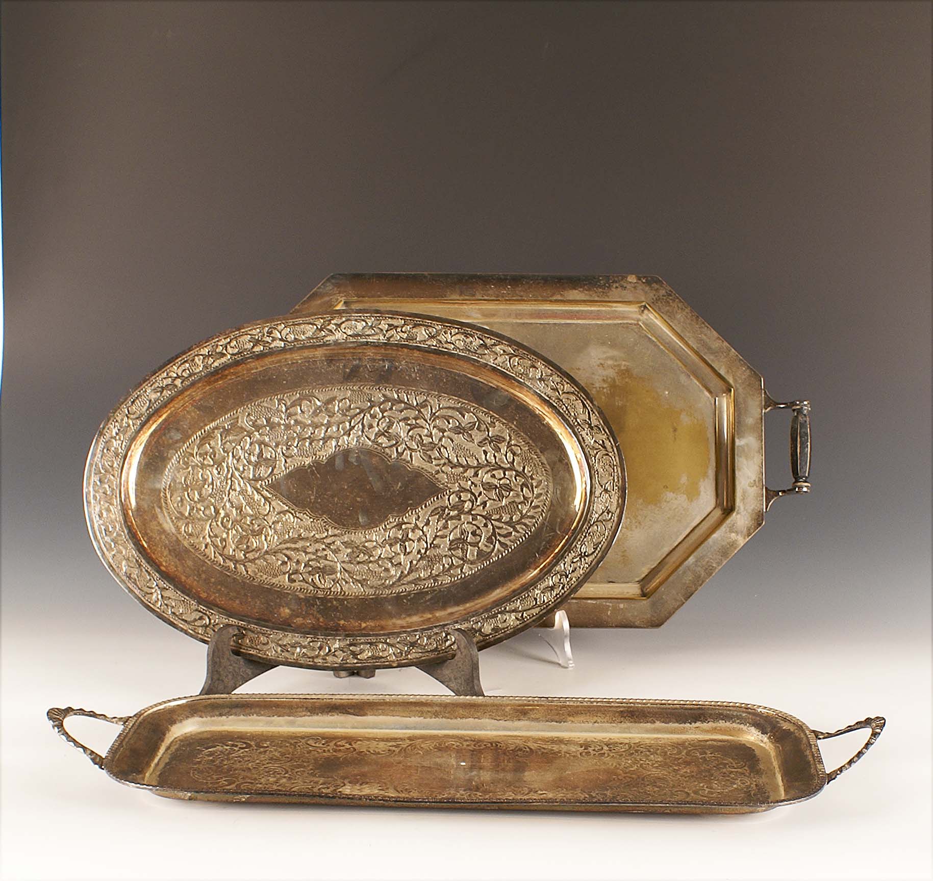 Lotto 728 | Lotto composto da tre vassoi in metallo, fogge e misure diverse.
