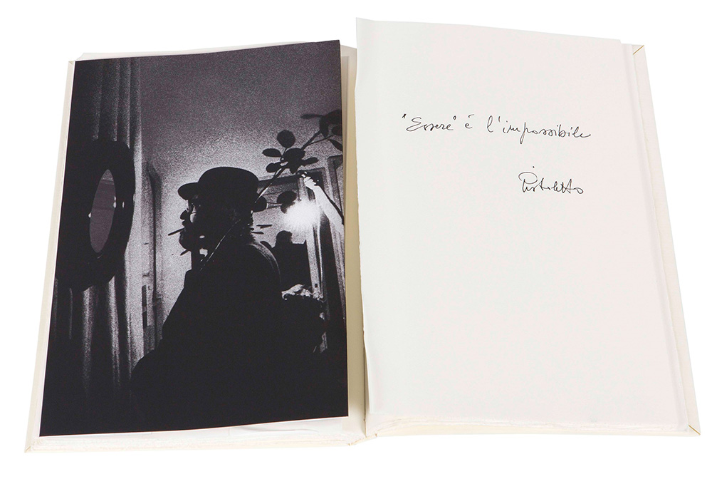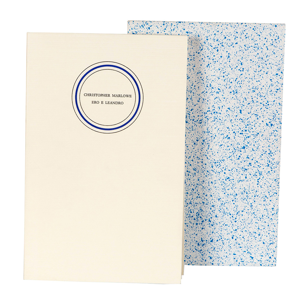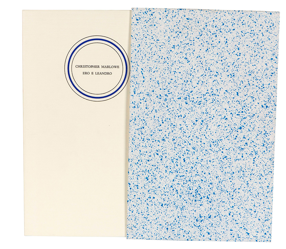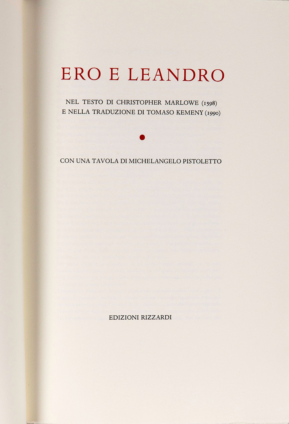 Michelangelo Pistoletto (1933), Ero e Leandro. Nel testo di Christopher Marlowe (1598) e nella traduzione di Tomaso Kemeny, 1990 catalogo brossura con astuccio, p. 81, 34 cm + 1 tavola di Pistoletto firmata dall’artista (recto: litografia - verso: superficie specchiante), tiratura di 120 esemplari in numeri arabi e XXX in numeri romani ed. 29/120 Edizioni Rizzardi, Milano