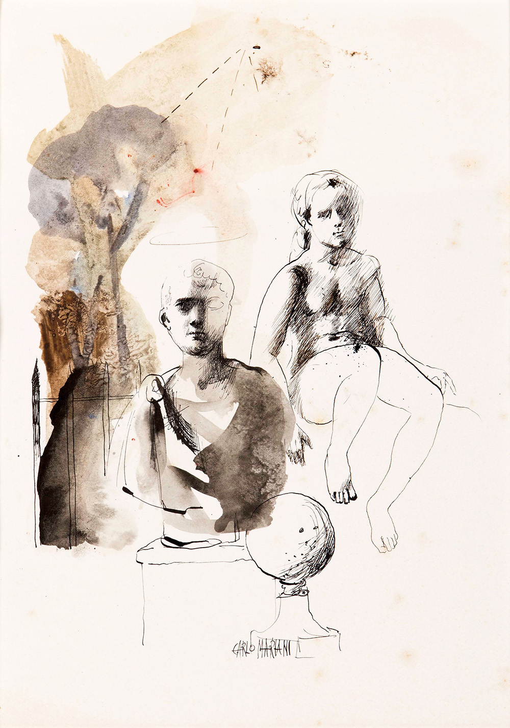 Carlo Maria Mariani (1931), Prospectant bianco oro tecnica mista su carta, cm 29,5x21 firmato in basso al centro