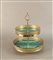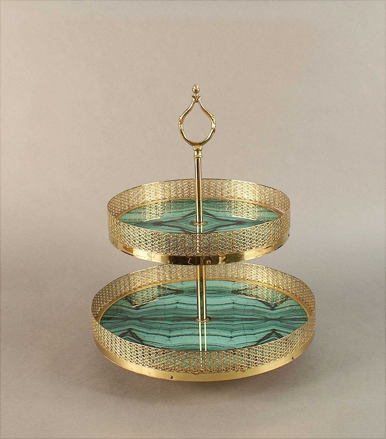 Alzata per la frutta a due ripiani in metallo dorato e decorato a simulare finta malachite, h. cm. 39, d. cm. 30.