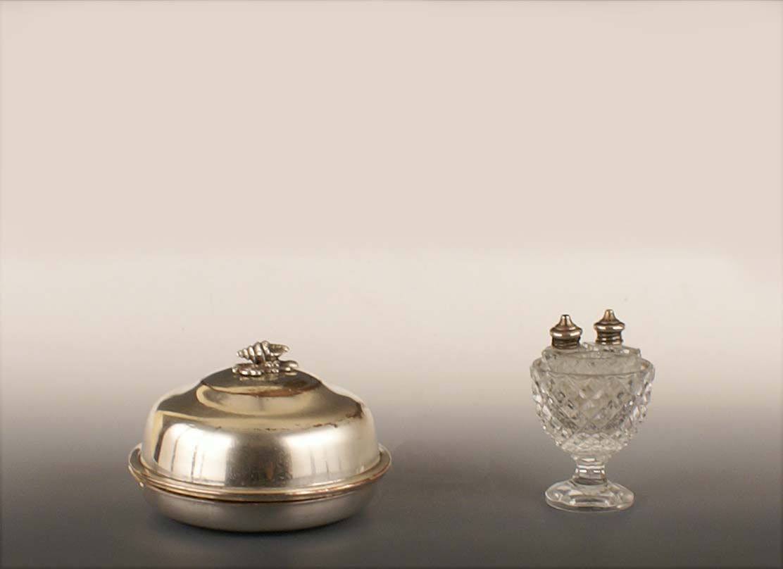 Lotto composto da due oggetti in metallo e vetro, fogge e misure diverse.