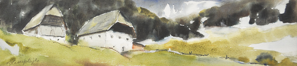 Rudolf Complojer (Mühlbach 1905 – Unterinn 1992) Landschaft mit Stadel und...