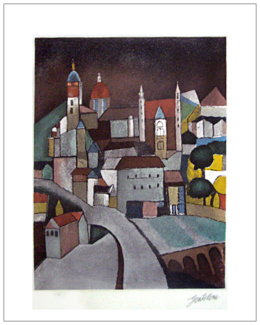 FRANCO GENTILINI Faenza 1909 – Roma 1981 Strada 1983 Acquatinta a colori es.IX/XXX. Firma in b. a d.; sul cartone di chiusura etichetta certificato di garanzia, num. archivio e timbro Konos Bottega d’arte, Milano. (70 x 50 foglio – 47 x 37 ser.) Tiratura: 125 es. num. arabi + XXX es. num. romani. ALLA MAGGIORE OFFERTA