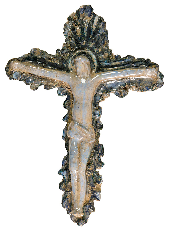 MARIO PORCÙ, Crocifisso, Anni ‘50, Scultura in ceramica dipinta, 41,5 x 31 x...