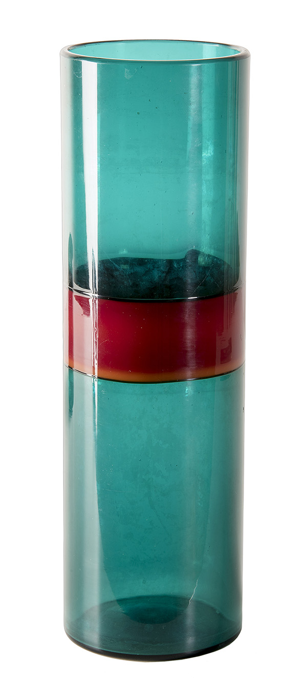 FULVIO BIANCONI, Vaso a fasce in vetro verde e rosso, 1950-56, Murano, Venini, h. 24,5 cm, Esemplari analoghi sono pubblicati in: Fulvio Bianconi alla Venini, a cura di M. Barovier con C. Sonego, Skira Ed. Milano 2015, pp. 190-209
