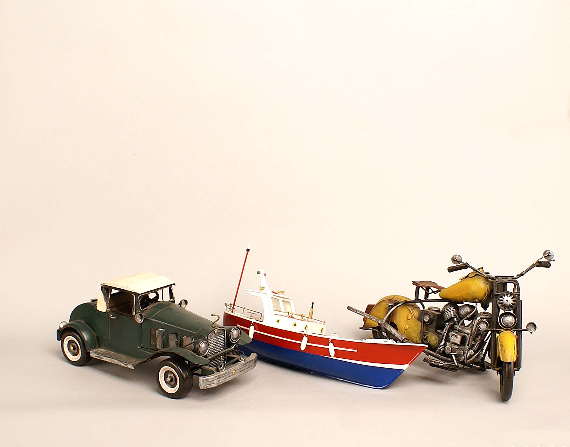 Lotto composto da tre riproduzioni giocattolo composte da un' automobile, una motocicletta e un gozzo.