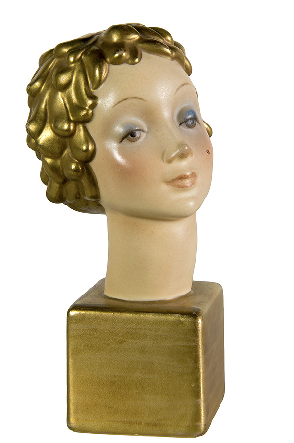 LENCI - TORINO, Testina di donna Disegno di Helen Konig Scavini, Ceramica dipinta, 13,5 x 6,5 x 6,5 cm, Marchio sotto la base: LENCI - ITALIA e Simbolo di Helen Konig Scavini PUBBLICAZIONI A. Panzetta, Le ceramiche Lenci, Catalogo Generale, Umberto Allemandi Editore, 1992, p. 288, n. 1118