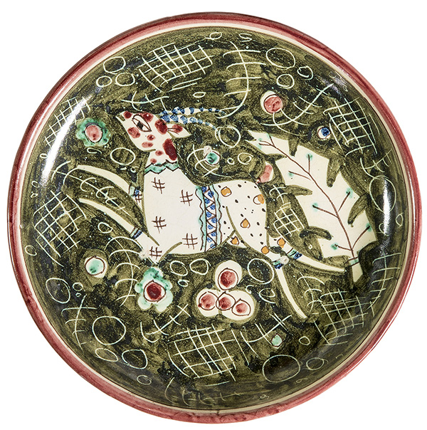 MATTEO DI LIETO, Piatto decorato a motivi animali e vegetali stilizzati, Anni ‘50, Ceramica dipinta, d. 27 cm, Luogo e firma sul retro: Amalfi, Italy, M. di Lieto