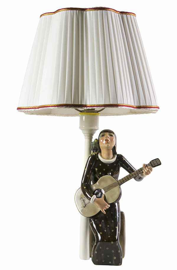 HELEN KONIG SCAVINI - LENCI, Usignolo e chitarra, 1935 Lampada , Scultura in terracotta maiolicata modellata a colaggio e smaltata in policromia sotto vernice, h. 52,2 cm, Marchio e data sotto la base: LENCI, XI.I.935 Un esemplare analogo, con diverso decoro sull’abito, è pubblicato in A. Panzetta, Le ceramiche Lenci, Umberto Allemandi Editore, 1992, p. 179, n. 434