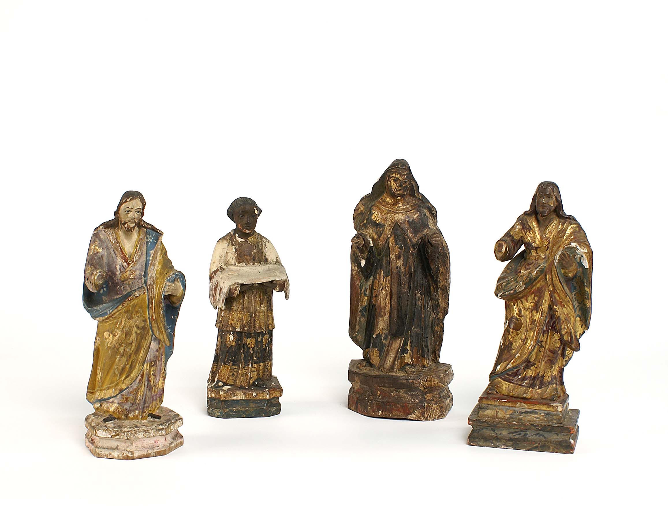 Lotto composto da quattro scultura lignee dipinte in policromia e parzialmente dorate, raffiguranti personaggi sacri, XIX secolo, misure diverse.