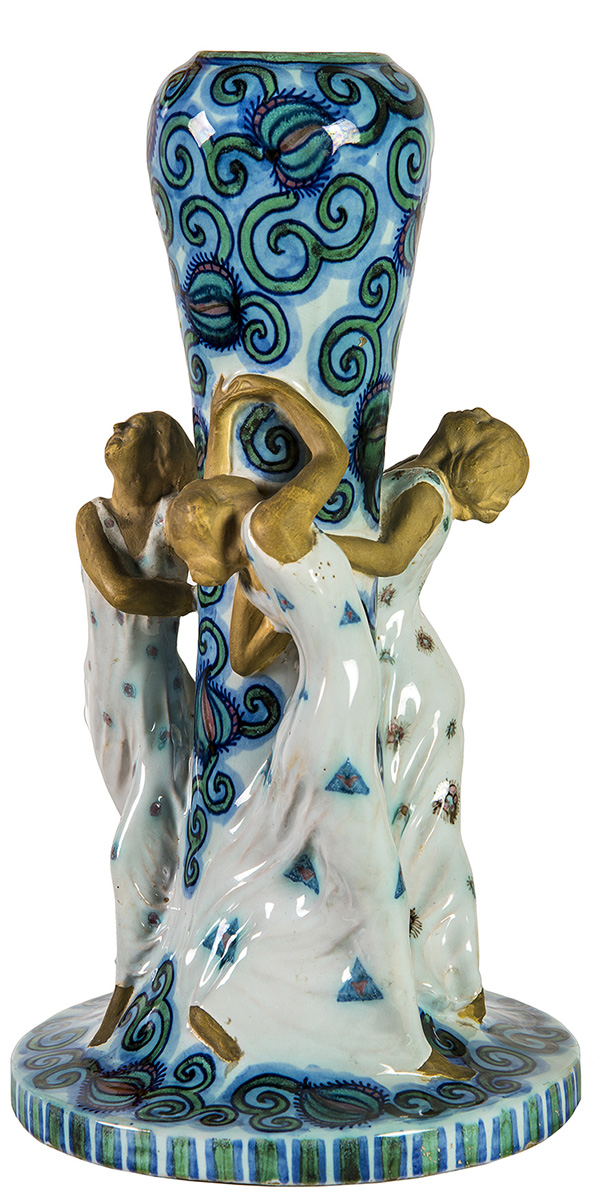 DOMENICO BACCARINI, Vaso con fanciulle danzanti a tuttotondo, Anni ‘20 (da un modello del 1903), Ceramica dipinta, h. 33 cm, Marchio sotto la base: FAENZA ZOLI Esemplari analoghi sono pubblicati in Domenico Baccarini, Catalogo Generale, a cura di S. Dirani e C. Spadoni, Electa, Milano 2007, pp. 156-157, nn. II.64 - II.65