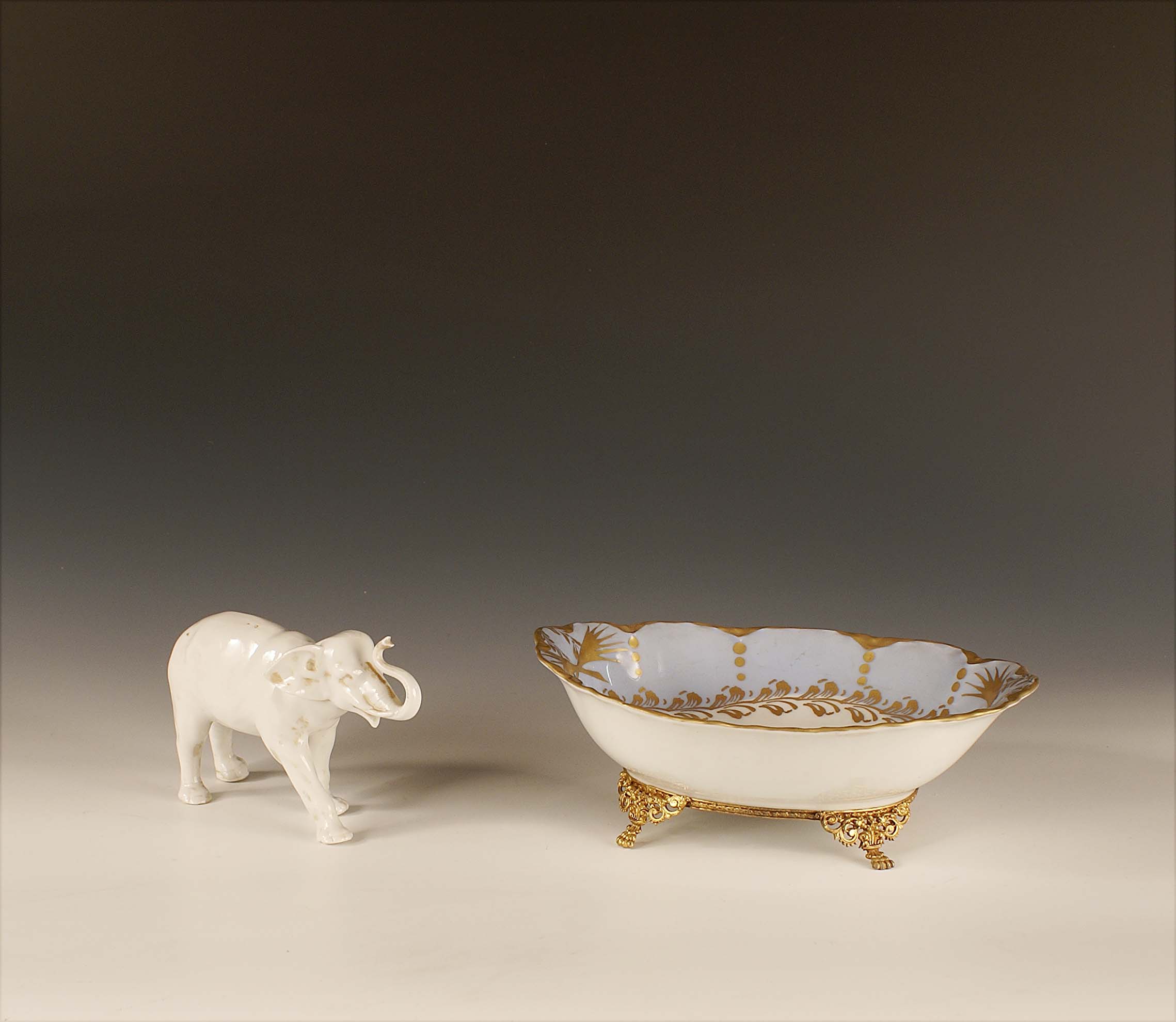 Lotto composto da un cestino in porcellana policroma di Limoges ed un elefante in ceramica smaltata.