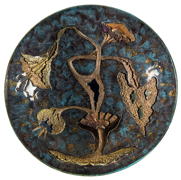 PIETRO MELANDRI, Piatto sui toni del viola e dell’azzuro con fiori in rilievo e dorature, anni ‘50-’60, Ceramica smaltata e dorata, h. 6 cm, d. 25 cm, Firma sotto la base: P. Melandri Simbolo grafico sotto la base: mela