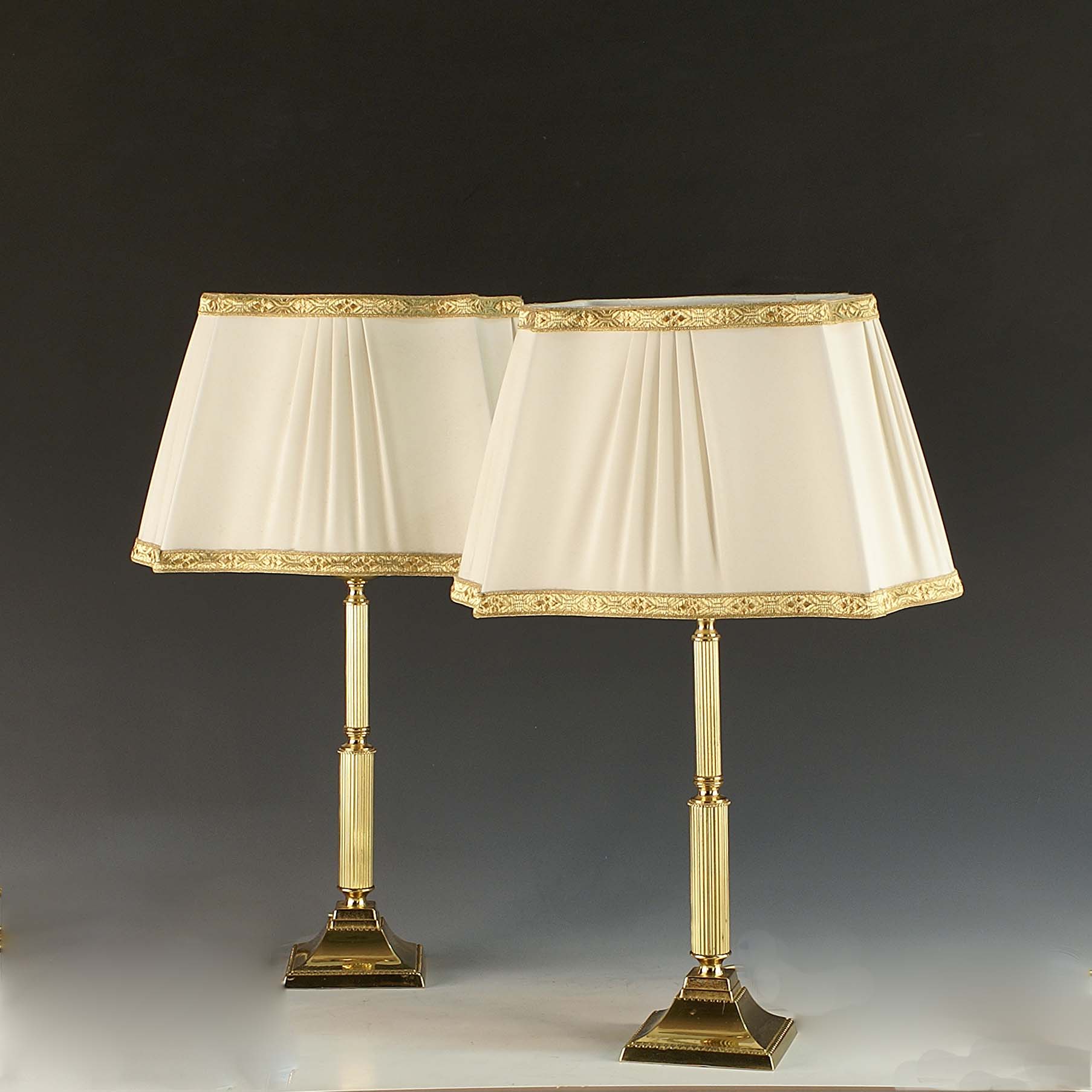 Lotto 818 | Coppia di abat-jour in metallo dorato, stelo a colonna con relativi paralumi,...