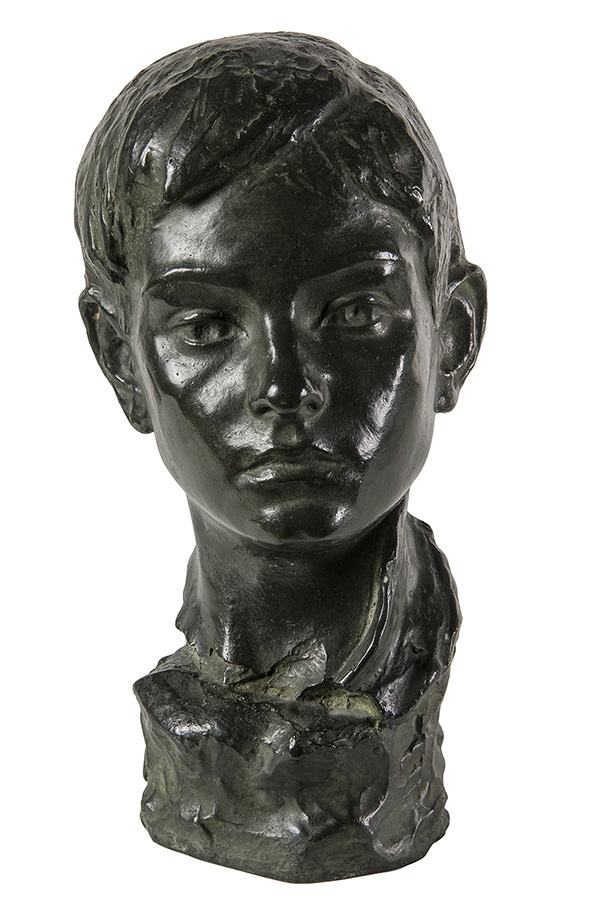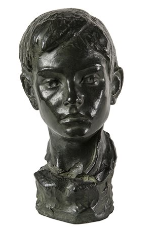 GAETANO MARTINEZ, Testa di giovane , Scultura in bronzo, h. 34 cm, Firma incisa al retro: G. MARTINEZ Etichetta all’interno della Confederazione Fascista Commercianti, 1932/XX
