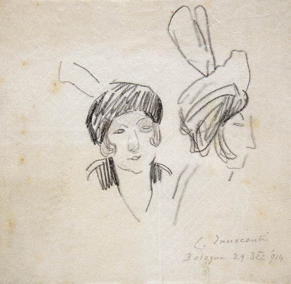 CAMILLO INNOCENTI, Donne con cappello, 1914, Matita su cartoncino, 18 x 18,5 cm, Firma, luogo e data in basso a destra: C. Innocenti, Bologna, 29 Dic ‘914