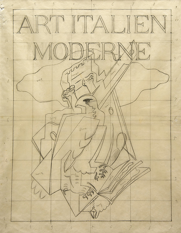 GINO SEVERINI, Studio per la copertina del libro ‘Art Italienne Moderne’ di Giovanni Scheiwiller, Parigi 1930, Matita su carta lucida, 42,5 x 33 cm circa, Etichetta al retro della Fondazione Palazzo Bricherasio di Torino Etichetta e timbro al retro della Galleria Arco Farnese di Roma ESPOSIZIONI Gino Severini prima e dopo l’opera, Palazzi Casali, Cortona 1983-84, n. 17, p. 119 Disegno italiano 1900 - 1960, Galleria Arco Farnese, Roma 1991, n. 129 Disegni del Novecento, Termoli 1995, n. 12 Luci del Mediterraneo, Palazzo Bricherasio, Torino 1997, p. 119 Disegno italiano 1900 - 1950, Archivio Arco Farnese, Roma 1999, n. 82 PUBBLICAZIONI Il disegno italiano, origini. Quadrimestrale di-segno e poesia, Ed. La Scaletta, San Polo di Reggio Emilia, giugno 1994, n. 22, p. 19