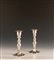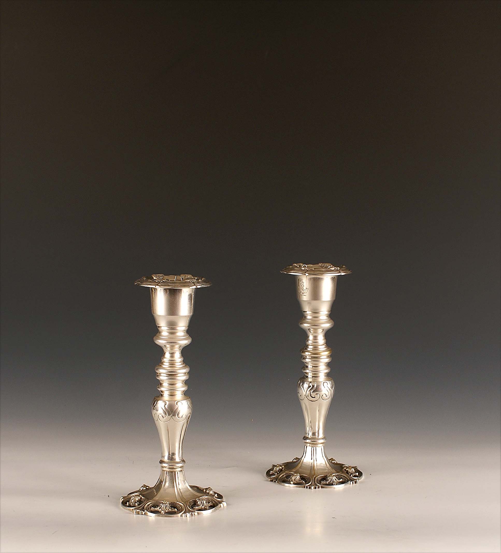 Coppia di candelieri in sheffield con stemma, h. cm. 24.