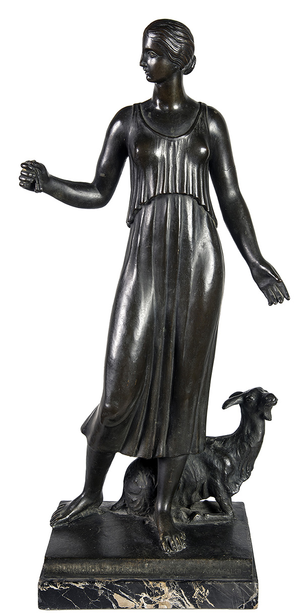 AMLETO CATALDI, Figura femminile con capretta, Gruppo in bronzo, h. 57 cm circa (con la base in marmo, h. 60 cm), Firma e iscrizione in basso: su disegno dell’Architetto Brasini - A. Cataldi