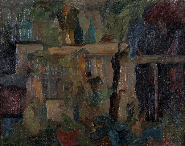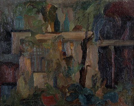 GIOVANNI OMICCIOLI, Orto 18, 1942, Olio su tela, 31 x 40 cm, Firma, data e luogo in basso a sinistra: G. Omiccioli, 942, Roma Titolo, firma e dedica al retro: Orto 18, G. Omiccioli, alla Signora Sandra Russo, G. Omiccioli 65