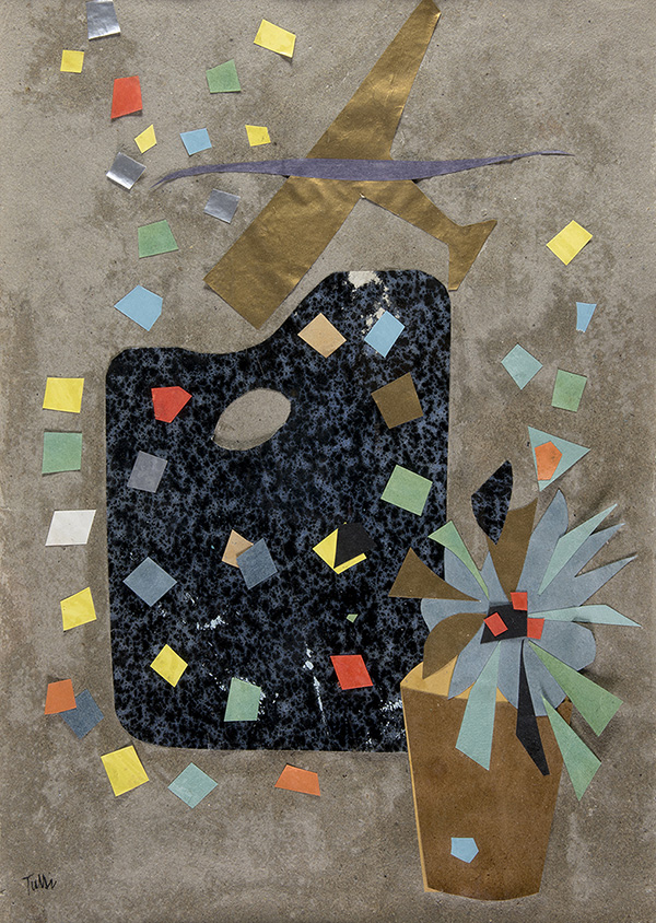 WLADIMIRO TULLI, Tavolozza + fiore + aereo, 1942, Collage su carta, 46 x 32...