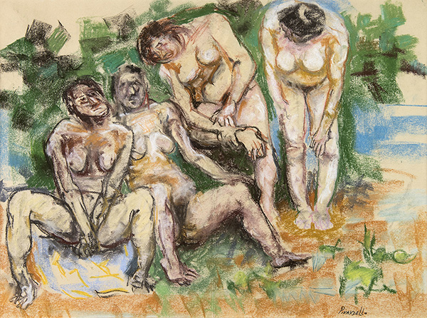 FAUSTO PIRANDELLO, Bagnanti, Pastelli a cera su carta, 31 x 41 cm circa, Firma in basso a destra: PIRANDELLO Autentica su foto della Galleria Gian Ferrari, Milano 4 dicembre 1978
