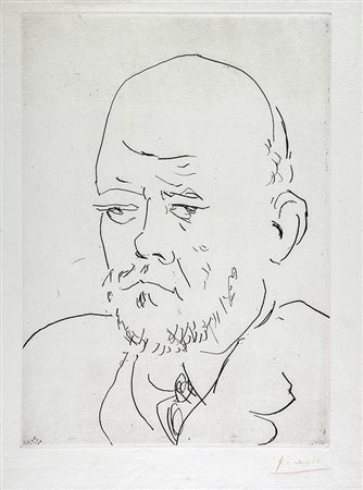 PABLO PICASSO, Ritratto di Vollard IV, 1937, Acquaforte su carta con filigrana de Montval, n. esemplare 14/100, 34,5 x 24,5 cm; 43,5 x 32,5 cm circa (il foglio), Firma in basso a destra: Picasso PUBBLICAZIONI Picasso, Suite Vollard, Ed. Turner, Madrid 1991, f. 100 Bollinger, n. 100 Bloch, n. 233