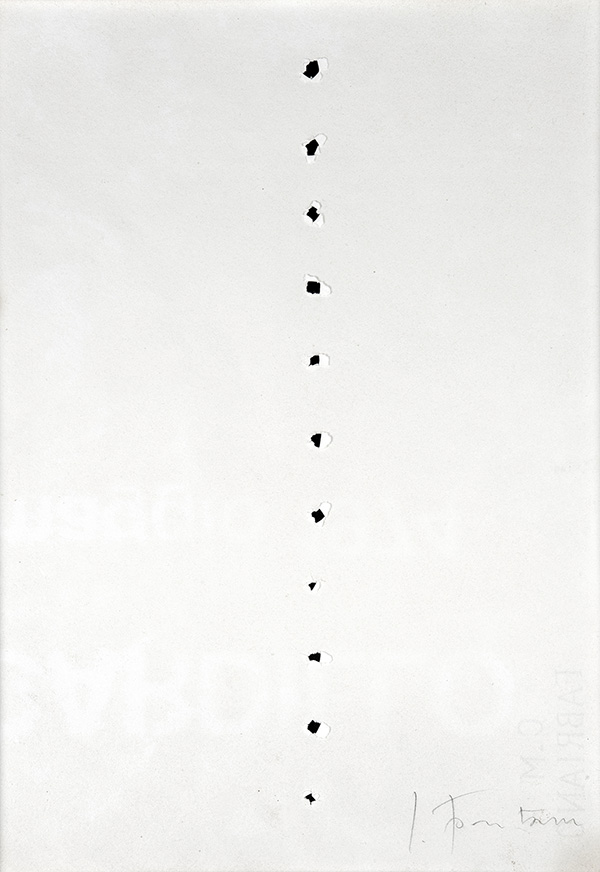 LUCIO FONTANA, Concetto spaziale, ante 1965, Matita su carta (Fabriano) con fori realizzati dall’Artista, 35,5 x 25,5 cm circa, Firma in basso a destra: Fontana 150 copie firmate e numerate, nel volume Apocalissi e sedici traduzioni di Giuseppe Ungaretti, ed. Bucciarelli, Ancona 1965 PUBBLICAZIONI H. Ruhé - C. Rigo, Lucio Fontana, graphics, multiples and more, Tuja Books, p. 16 Autentica su foto dell’Archivio Lucio Fontana, Milano 19 settembre 1974